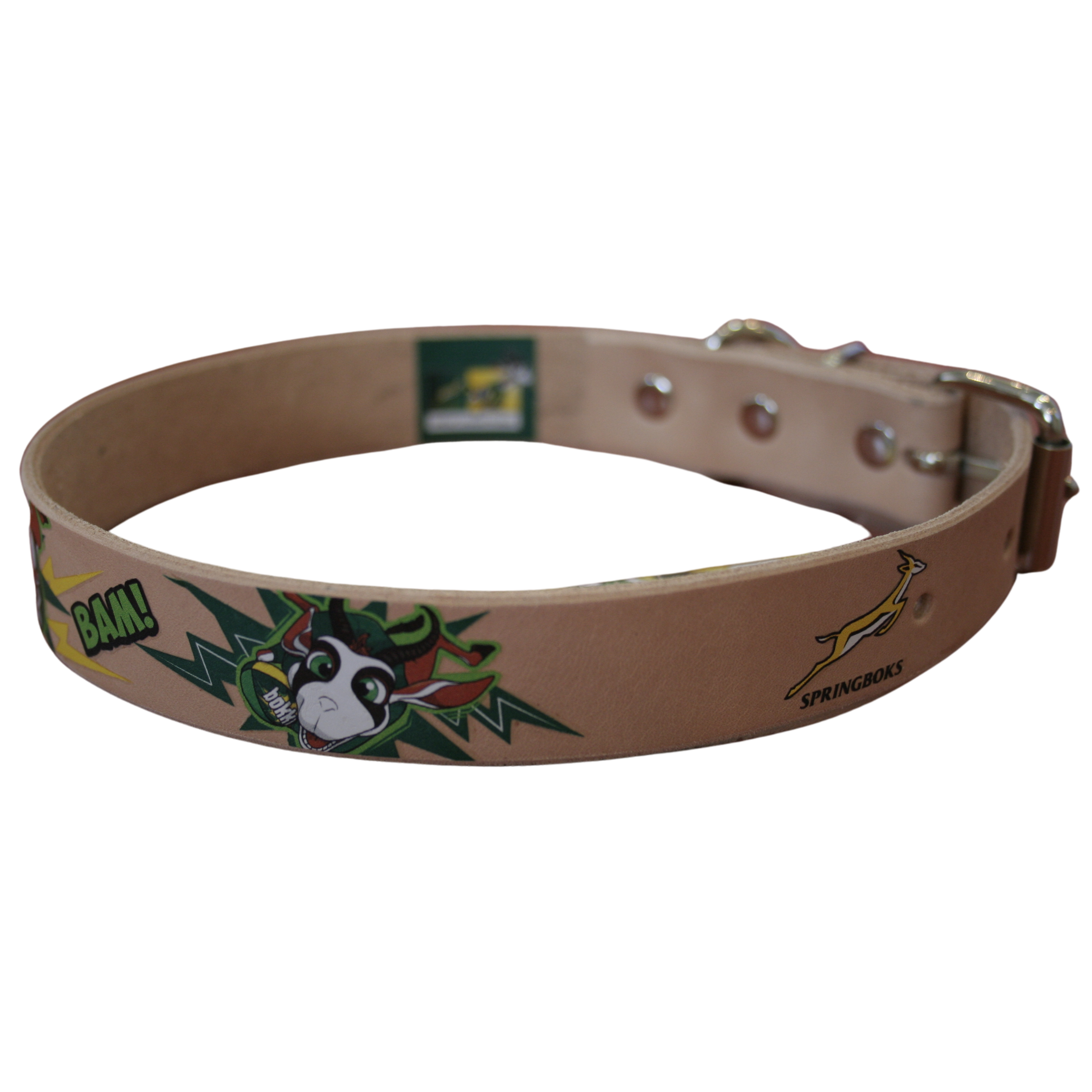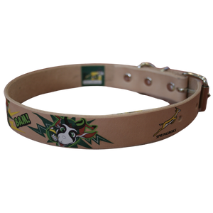 Elevate your pup's style to "Try-scoring" elegance with our Bokkie Licensed Genuine Leather Dog Collar – where rugby passion meets canine fashion! Crafted from sustainably sourced leather in South Africa, this collar is more than leather; it's a commitment to eco-conscious flair. The metal buckle and D-Ring ensure your furry supporter stays securely styled for all sporting endeavors. Whether chasing balls or chasing tries, this collar is the ultimate blend of style and strength. Let your pet roar with Bok pride, because when it comes to canine fashion, this collar is a winning conversion every time!